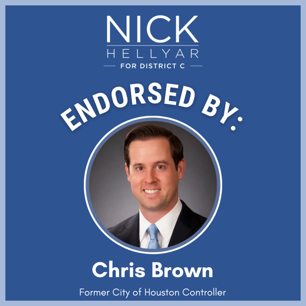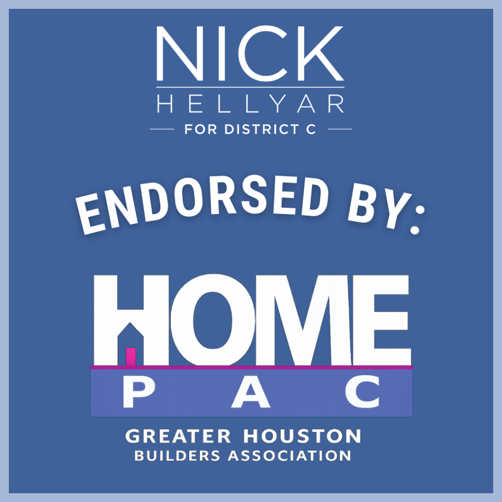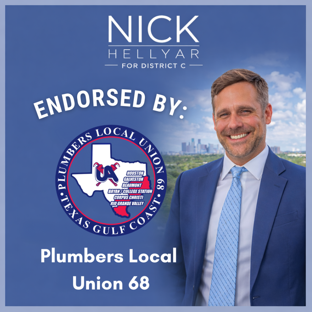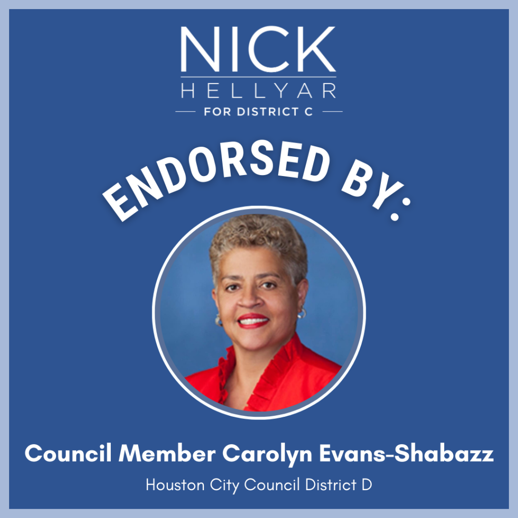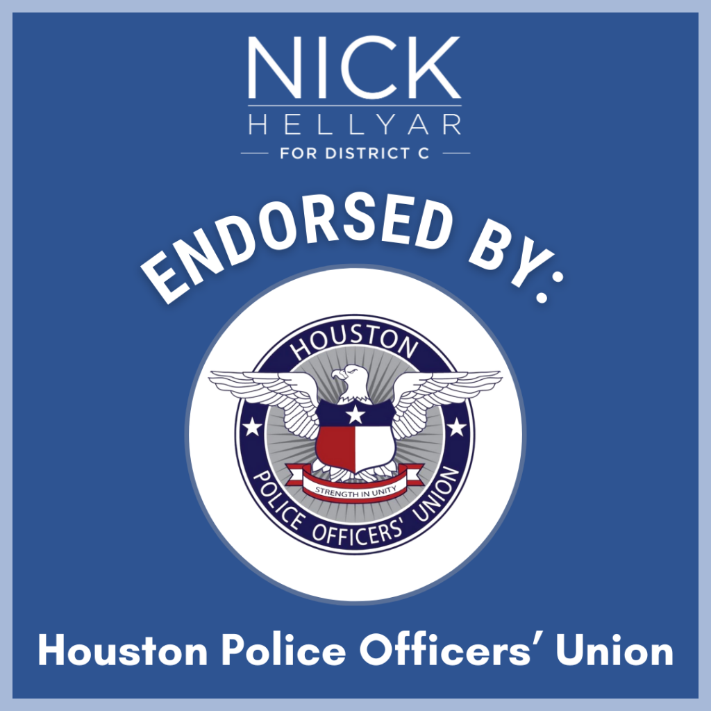 District C residents deserve to know that they’re safe in their homes and in their neighborhoods. Nick Hellyar will advocate for more cadet classes for the Houston Police Department and support expansion of programs like the mental health unit. He wants HPD to be a presence in the community to prevent crime and to cooperate with ICE only when dealing with persons accused of violent crimes. Nick has been endorsed by the Houston Police Officers’ Union.