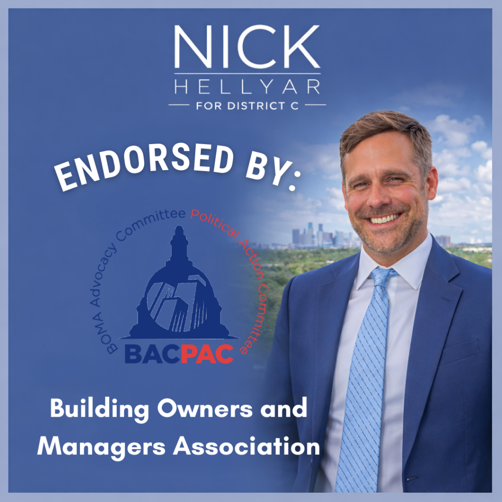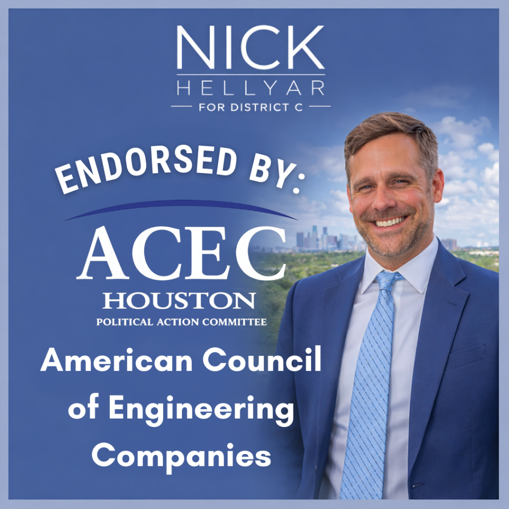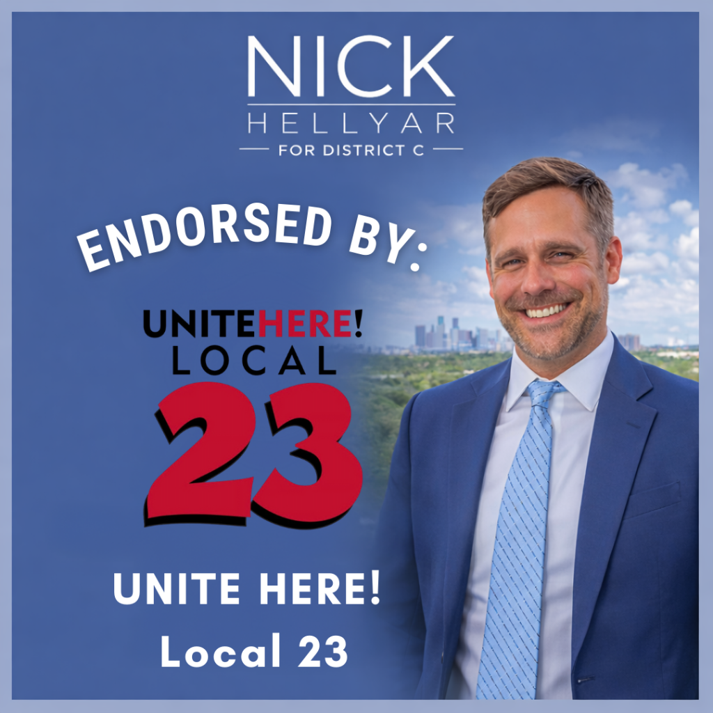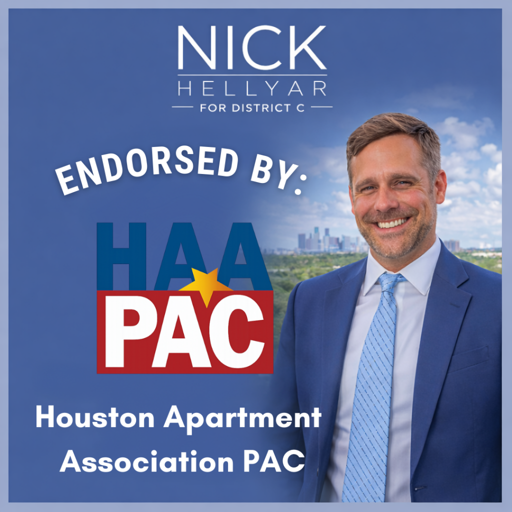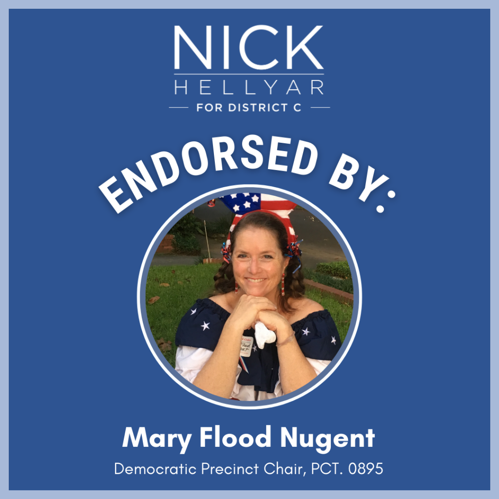 District C residents deserve to know that they’re safe in their homes and in their neighborhoods. Nick Hellyar will advocate for more cadet classes for the Houston Police Department and support expansion of programs like the mental health unit. He wants HPD to be a presence in the community to prevent crime and to cooperate with ICE only when dealing with persons accused of violent crimes. Nick has been endorsed by the Houston Police Officers’ Union.